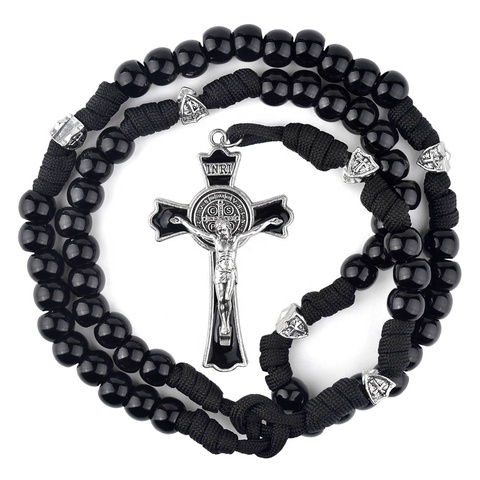Paracord สีดำลูกประคำผู้ชาย12มม. ลูกปัดอะคริลิคข้ามสร้อยคอสำหรับลูกประคำขรุขระคาทอลิก